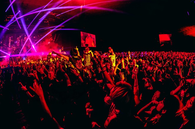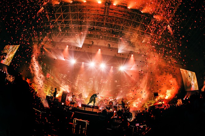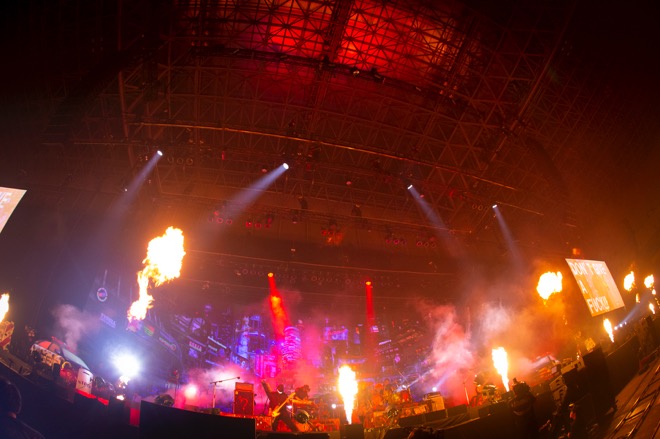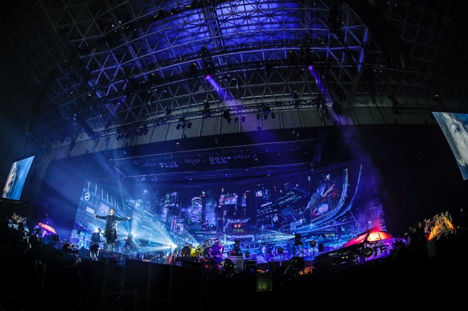 広大なアリーナ会場にスタンディングエリアと座席エリアが混在した客席。集結したオーディエンスの発する熱気が、白い蒸気となって立ちこめる場内は12月とは思えぬ暑さ。そのヴェールの向こうに左右幅50m以上はあろうかというステージがあった。