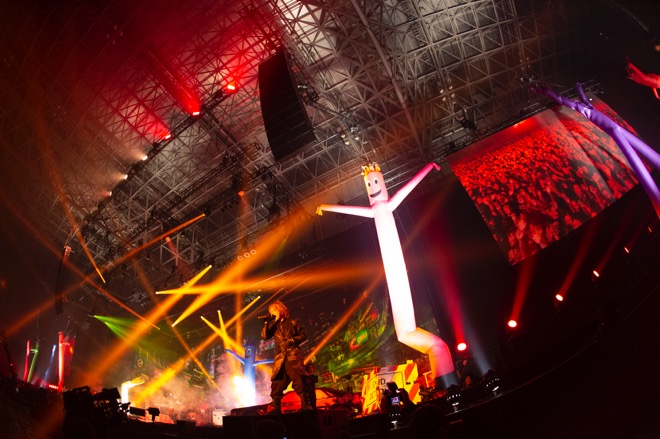 「幕張ちゃん、楽しんでる? すごく良い眺め。最高じゃない? 『ANTI』がリリースされてから半年経ったんですけど、こんなにみんなから愛されるとは思わなかった。今日は最終日、一番すごい形を作ってあげないとかわいそうじゃない? 『ANTI』っていうアルバムは招待状みたいなもので、君たちがここへ来て初めて完成する。ただし、中途半端な盛り上がりだったら、それを完成とは言いたくないんですよ。最後にオレたちで完成させたいよな、見たいだろ? 芸術的なカオスをみせてくれよ! やっちまえ、幕張!!」──HYDE