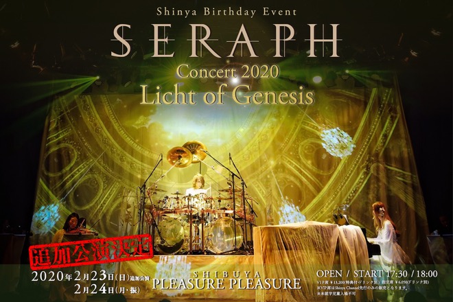 DIR EN GREY / SERAPHのドラマーShinyaの誕生日にあたる2月24日(月・振)、渋谷 Mt.RAINIER HALLにて特別公演<Shinya Birthday Event – SERAPH Concert 2020 Licht of Genesis>が開催されることは既報のとおり。このたび、その前日となる2月23日(日・祝)に追加公演が開催されることが決定した。