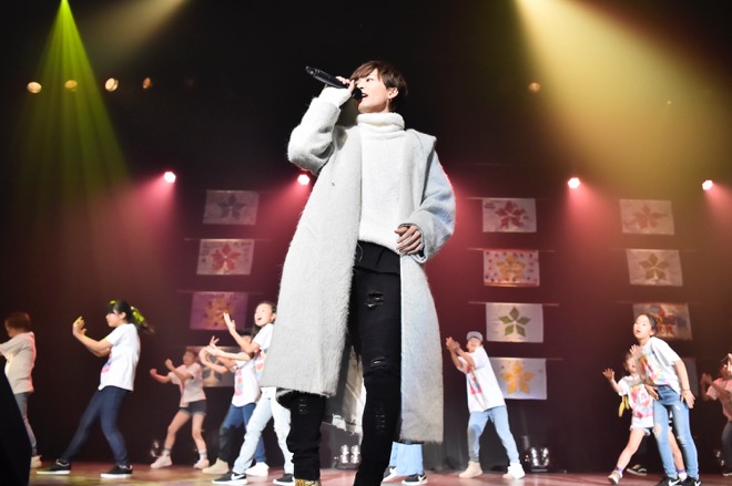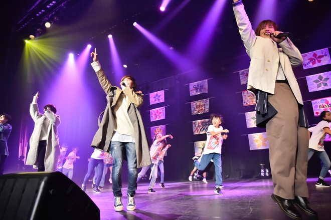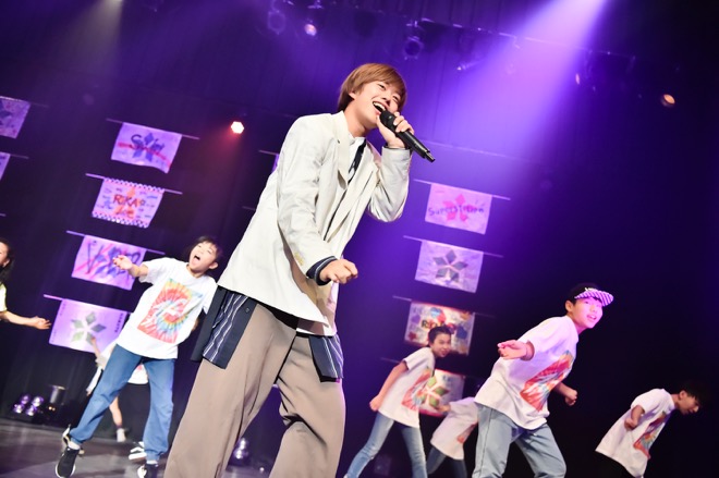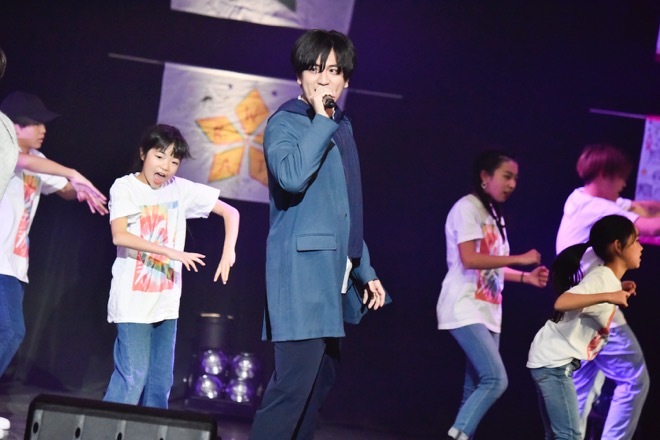 ▲KAITO「どうも、First placeです!」と会場がどよめく中でサプライズ出演。事前に何も聞かされていないキッズ達は突然のメンバー登場に驚きの表情を見せ、会場全体が歓声に湧いた。突然のことにキッズダンサー達は若干ギクシャクする場面が見られたものの、嬉しさを全身で表現しながらエネルギーに溢れる「L.D.Love」を見せてくれた。