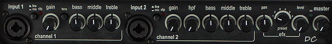 ▲コントロールパネルは上面奥に配置。2チャンネル仕様でそれぞれマイク/ラインに対応、3バンドEQを搭載。エフェクトは6種をプリセットする。