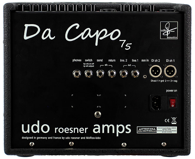 「Da Capo 75」は、カスタムメイドの8インチツインコーンタイプのスピーカーを搭載した、2チャンネルのアコースティック楽器用のコンボアンプ。コンパクトな筐体ながら75Wの出力を誇り、6種類のエフェクトも搭載している。Udo Roesner Amps製品は、ドイツとフランスのMARco-labs社にてUdo Roesner自身によって設計・開発。生産を楽器生産で定評のあるインドネシアで行うことにより、クオリティを維持しながらリーズナブルな価格を実現している。
