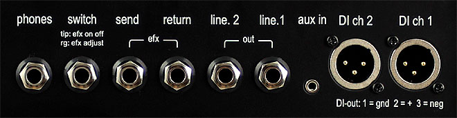▲背面にはヘッドホンアウトやフットスイッチ用端子、出力レベルが異なる2つのラインアウト、2つのチャンネル独立のDIアウトなど豊富に用意。エフェクトループも備える。
