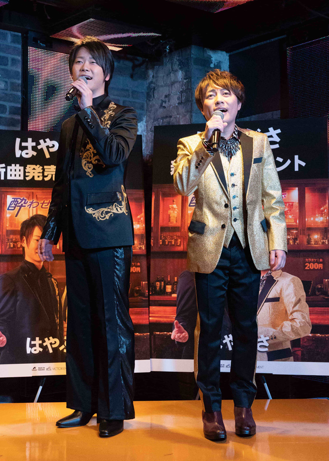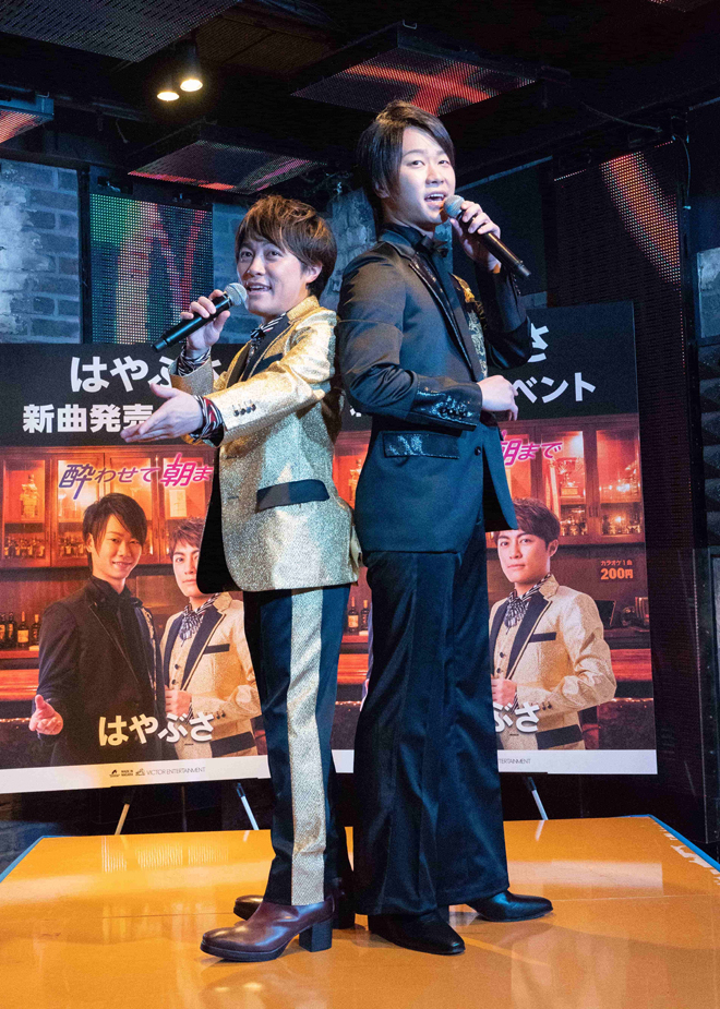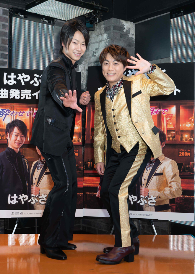 デビュー8年目を迎えたはやぶさ(ヒカル、ヤマト)が、12月18日に12作目となるニュー・シングル「酔わせて朝まで」(作詩:かず翼、作曲:平義隆)を発売したのを記念し、同日、東京・六本木のカラオケバー「BAN×KARA ZONE-R」で新曲発表イベントをおこなった。
