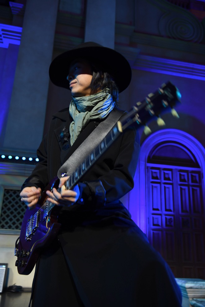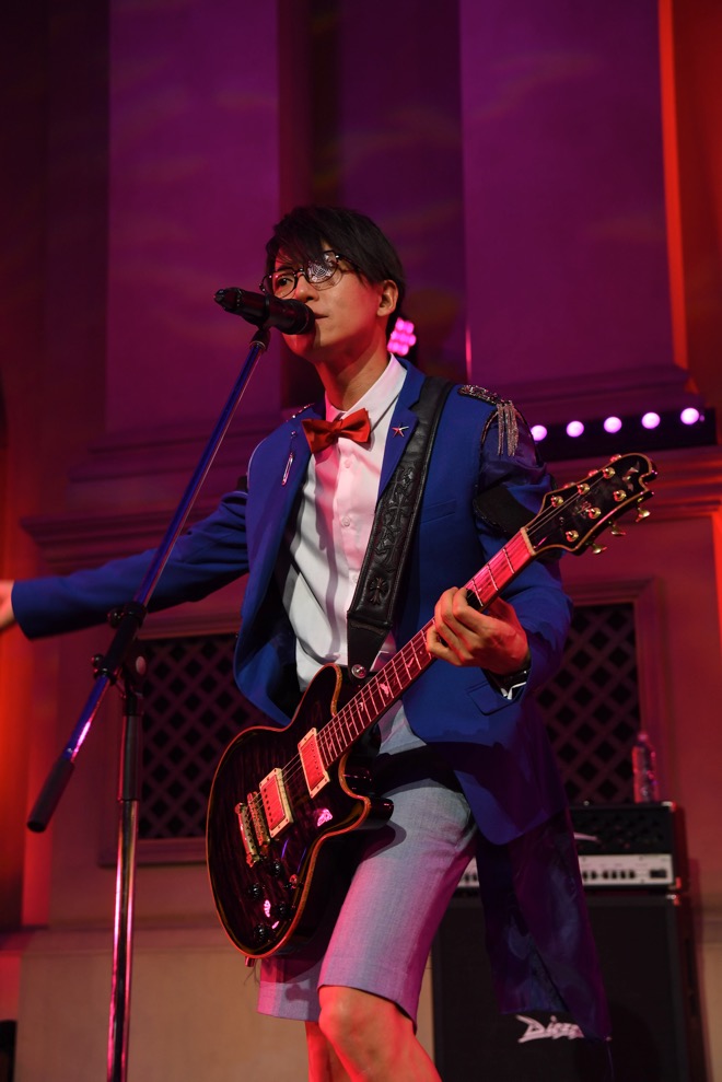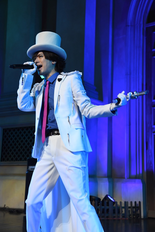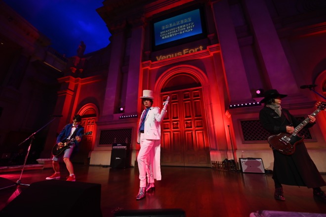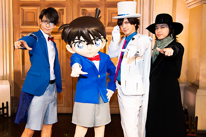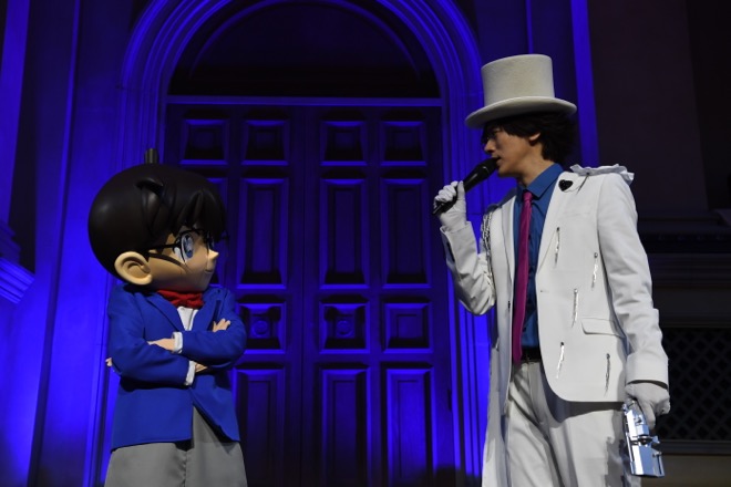 最初のMCでは、“名探偵シンペイ” “黒の組織 アキ” “怪盗ダイゴ”と、それぞれの衣装に合わせてメンバーが自己紹介。アニメの世界からそのままキャラクターが飛び出してきたような仕上がりだ。改めてバンドと『名探偵コナン』とのこれまでの歩みについて触れた後、続けて披露されたのは「Miss Mystery」だった。2曲を終えて、DAIGOの掛け声で本日のスペシャルゲスト“江戸川コナン”が登場。場内からはさらなる歓声が上がった。