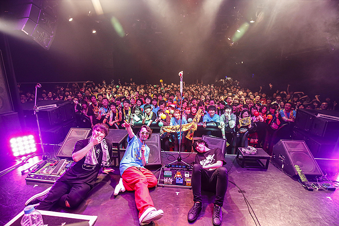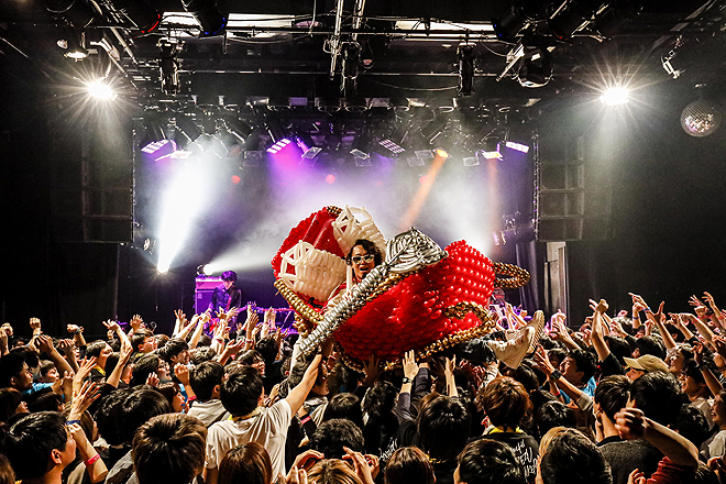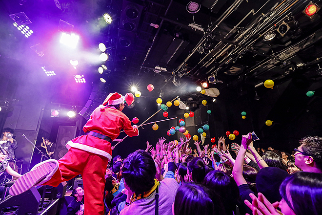 続く「クリスマスタウン」で、会場のムードは一気にクリスマスムードへ。ユタニがサンタに扮して登場。そして、キャプテン★ザコと共に、北斗の拳のネタを披露しながら会場をさらに盛り上げ、楽曲の最後にはsajiからのプレゼントとして風船が会場に降り注がれた。そして、最後の1曲へ。「ハッピーになろうぜ!!」と、惜しまれながらも「シリアル」で幕を閉じた。
