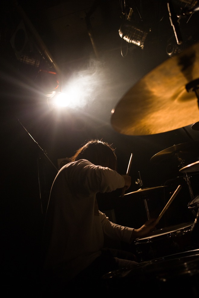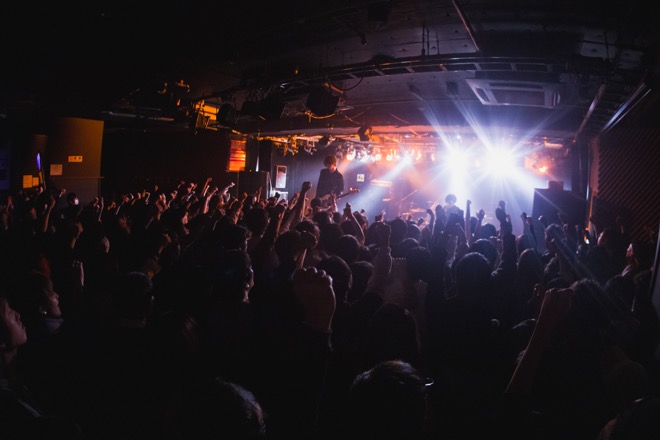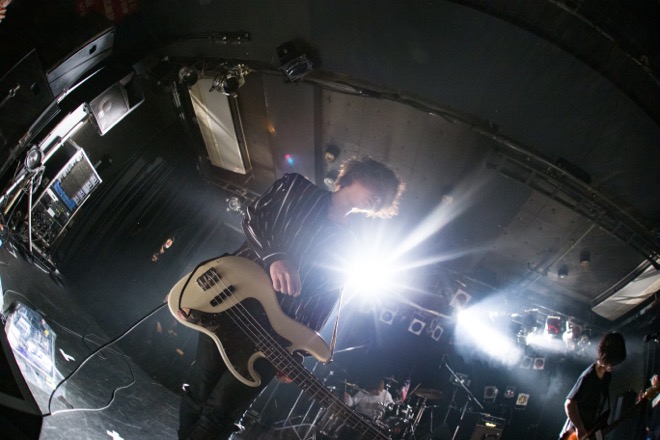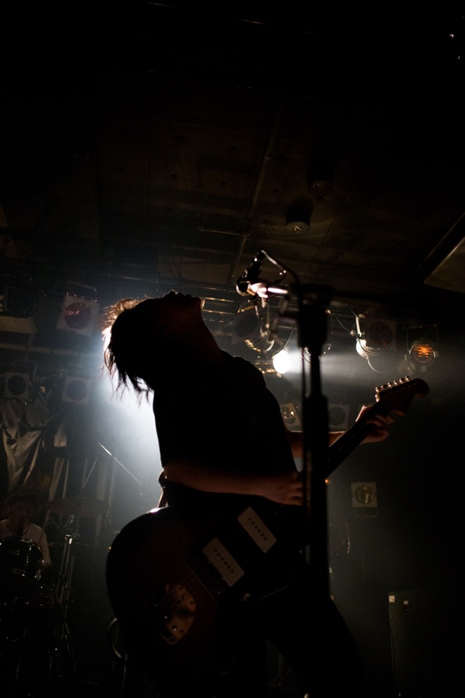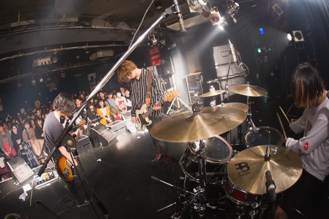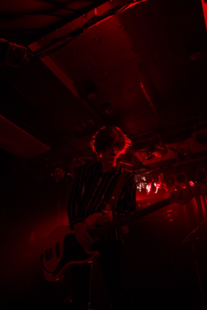 「このバンドを始めて、最初に作った曲」という紹介から、「もう一つの世界」でライブはスタート。スリーピースから放たれる音は、ストレートで余計な飾り気がないぶん生々しく、その中を芯のある片桐の歌声が凜と響き渡る。音から、言葉から、3人に脈打つロックの衝動が抑えきれずに溢れ出てくるようだ。それはきっと、生きるために叫ばずにはいられない叫び、生きるために掻き鳴らさなければいけない音。2曲目の「辿る」では、マツイユウキ(Dr)のタイトなビート、片桐とヤスカワアル(B)がステージの際まで身を乗り出して煽る気迫に、オーディエンスもコブシを掲げて応えていた。