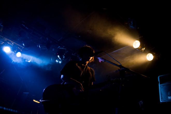ソールドアウトの会場は、ゲストのMaki、神はサイコロを振らないの2バンドの熱演が終わった時点で、すでに期待の熱気が立ちこめている。しかしそれは、ロックで楽しく踊ろうと構えている熱気というより、ステージにしっかりと向き合ってじっと息を呑むような、心地いい緊張感。真剣な眼差しのオーディエンスに拍手で迎えられ、Hakubiの3人が静かに現れた。