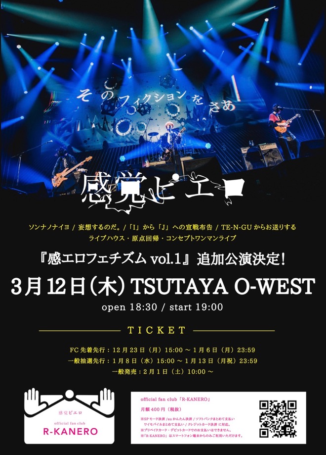 感覚ピエロが2020年2月、コンセプトワンマンツアー<感エロフェチズム vol.1>を開催することは既報のとおり。このたび同ツアーの追加公演が2020年3月12日に東京・渋谷TSUTAYA O-WESTで行なわれることが発表となった。