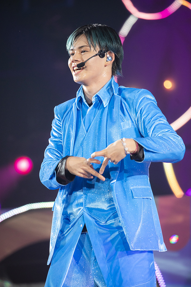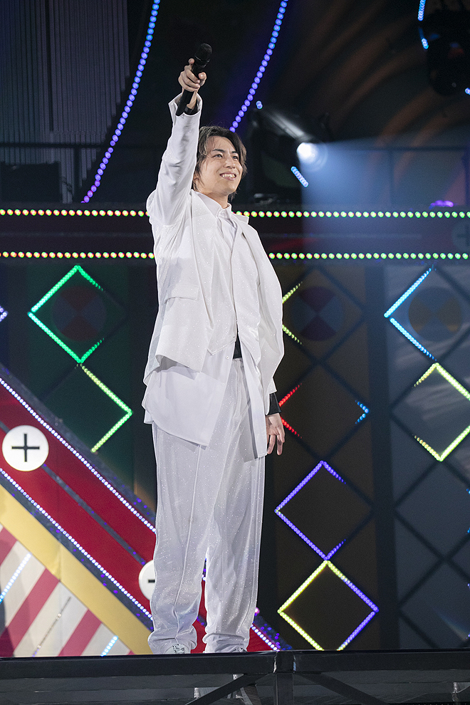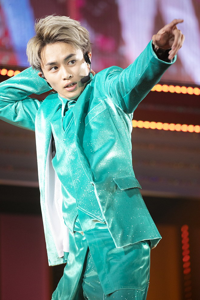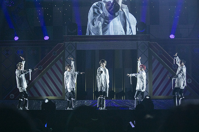 そして黒から白へと衣替えし、ジャズアレンジされた「Whiteout」からは、魅せて聴かせるブロックがスタート。「DJ Dominator」「Hey Hey Hey」といったソウル~ファンクな大人びた楽曲も余裕の表情でノリ良くこなし、白黒つかないパステルカラーな感情を繊細なグラデーションで、かつ伸びやかに表現するタカシのボーカルも、着実に引き出しが増やされている。そんな彼だからこそ、雪が舞う紗幕を背に叶わぬ恋情を真っ直ぐに歌い上げる「Snow break」の破壊力はすさまじく、リョウガとユーキ、カイとタクヤによるドラマティックなペアダンスでも切ないエモーションが爆発。結局ダイナミックな演出や舞台セットも、すべてはメンバー自身の着実な進化があるからこそ活きるものなのだ。