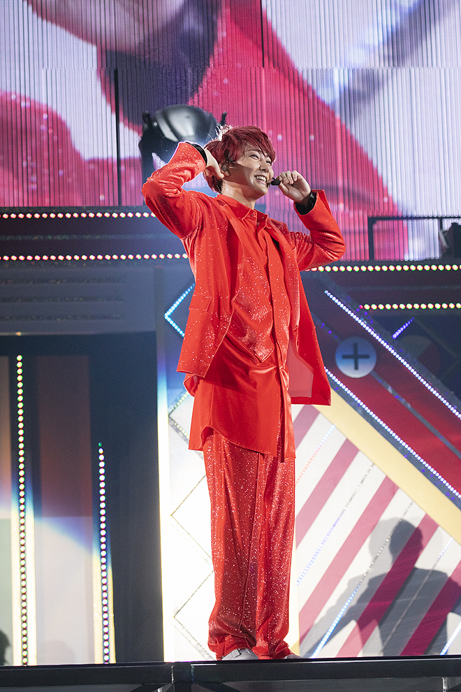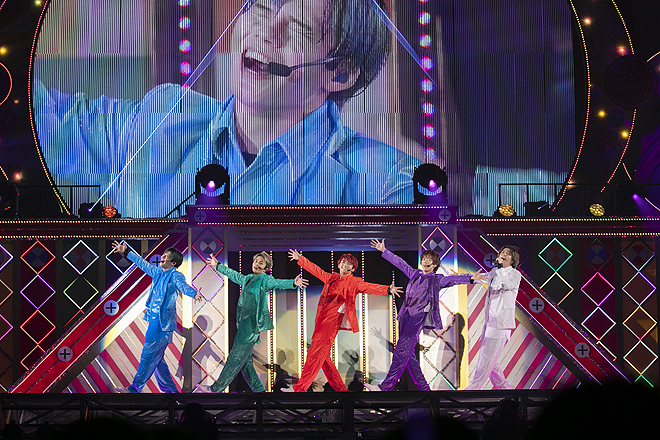 サンタが空を飛ぶクリスマス仕様のオーバーチュアに続き、1曲目のイントロでオルゴールの音色が流れたとたん、スタンドてっぺんの立見席までペンライトで埋め尽くされた場内は歓喜の渦に! 紗幕が飛ぶと鮮やかなカラースーツに身を包んだメンバーが現れ、パステルカラーのネオンに輝く巨大ステージの前で披露したのは「Fantasy Love Train~君の元までつながるRail~」だ。“シャンシャン”とスレイベルの音が乗ったファンタジックなナンバーは、超特急のライブでも冬にしか歌われない大人気のラブソングで、ドリーミーな空気感が今から始まるスイートな時間への期待をかき立ててくれる。しかし「Pastel Shades Christmas、ほな、いきまっせ!」というリーダー・リョウガの号令からは、特効の火薬を合図に爆アゲ曲「バッタマン」を早くも投下。現在休養中のユースケに代わり、全力シャウトはメンバーが交代で務め、間髪いれずに超特急史上最大級に破天荒な新曲「Don’t Stop 恋」がライブ初披露されれば、大阪城ホールは一気にカオスの海と化す。センターを務めるタクヤの靴をタカシが膝に乗せて整える振りを皮切りに、目まぐるしく展開の変わるエキセントリックな曲に乗って、いきなりビームを放ったり、5人で腕を組んだりと、ナンセンスでシュールな踊りは“ダンス”のパブリックイメージを大幅に逸脱して“摩訶不思議”の一言。にもかかわらず熱く沸き立ち、サビになれば“どすこい!どすこい!”と声を合わせてペンライトを突き上げる8号車の高い対応力には、まったく脱帽するほかない。
