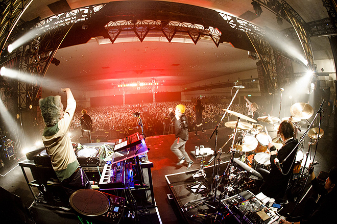 おハコとも言えるロットンの「THIS WORLD」をワンコーラスだけ演奏し、フロアを瞬時に一体化させたDragon Ash。DA流のライブ賛歌「Mix it Up」で会場のテンションをさらに上げた後、T$UYO$HI (The Bonez / Pay money To my Pain)をサポートベースに迎えた「Fly Over feat. T$UYO$HI」を演奏。そして、「今自分たちがここで板(ステージ)の上に乗ってる理由を音楽にしてきました」というKj(Vo./Gt.)の言葉の後に新曲「ダイアログ」を披露。ロットンやDragon Ash自身だけでなく、当たり前なはずの人や何かを喪失する悲しみは誰もが必ず経験する事。「Fantasista」でひとしきり盛り上げた後、「このバンドの人生に捧げます」という言葉とともに予定外のラスト曲として演奏されたのは、ロットンの「マンダーラ」だった。Kjのラップに続けて最初のサビは観客が、二度目のサビはNOBUYAが歌い、次のラップパートではN∀OKIが吠える。Dragon Ashの演奏をバックに涙を浮かべながら熱唱するロットンの2人が最後に叫ぶ。「今日も生き延びろ!」