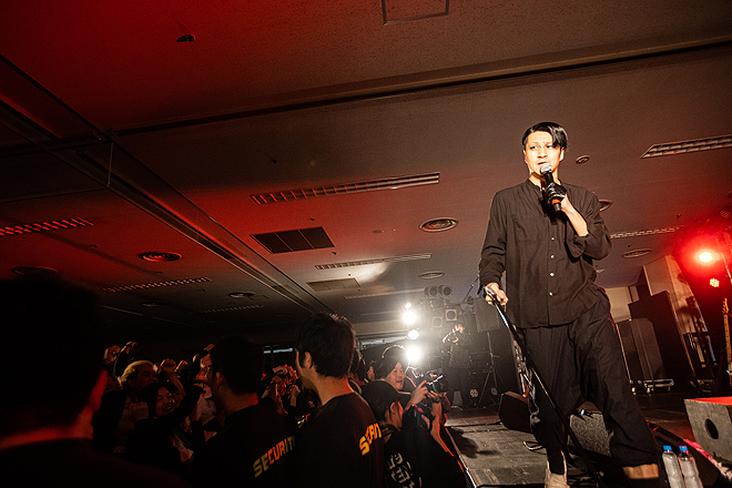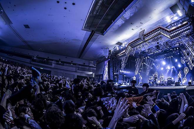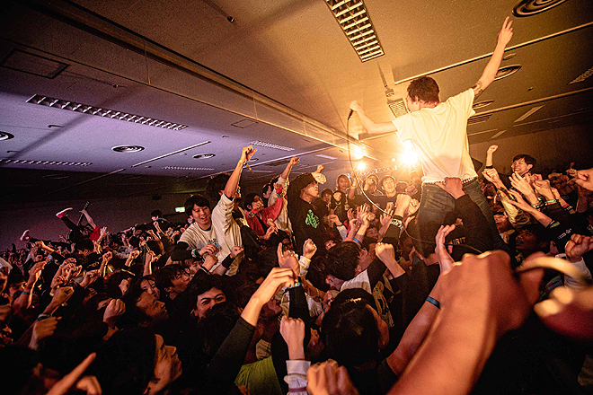 気が付けば既にNOBUYAは客席に降り、続いてN∀OKI、KAZUOMI(Gt./Programming)も客の上。1曲目から金閣をカオスに落とし込んだ彼らは「銀色スターリー」で攻め立て、N∀OKIが「後悔なく出し尽くせ! 瞬間を生き延びろ!」と吠えて「世界の終わり」で更に攻め立てる。とめどなく溢れ出てくるアドレナリンを燃料にした観客の勢いも凄まじく、客席エリアは拳をふりあげる者、5人と一緒に歌う者、ダイブ、肩車、ジャンプ、モッシュと大混乱。
