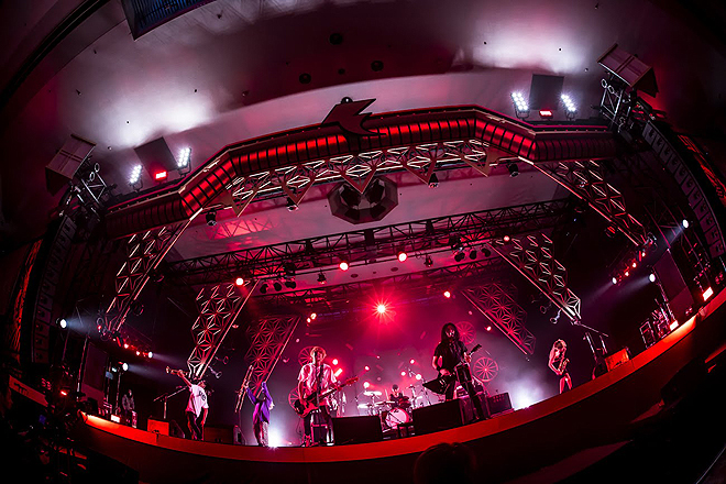 「サイコ」→「大嫌い」→「ENDER ENDER」と続け、スクリーモとヘヴィなサウンドを響かせてフロアを圧倒していくMUCC。ROTTENGRAFFTY のトリビュート盤『MOUSE TRAP』にも収録されている「かくれんぼ」のカバーが始まるとロットンのN∀OKIとNOBUYA、トリビュートにも参加していたMAN WITH A MISSIONのDJ Santa Monica (DJ/Sampling)もステージに登場。さらに逹瑯(Vo.)が20周年を迎えたロットンへの祝辞を述べている最中、ステージに現れた侑威地がYUKKE(Ba.)とミヤ(Gt.)に何かを食べさせる様子がスクリーンに映し出される。ストイックな演奏とのギャップも刺激的な、アーティストが入り乱れる賑やかなステージとなった。
