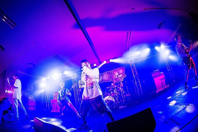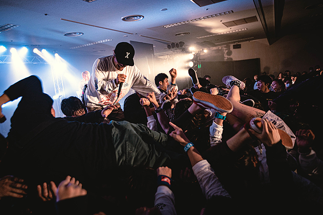 Hiro(Vo.)の「お前らいけるか!?」という言葉を合図に始まった激速チューン「Further Away」での容赦ない先制攻撃にも一切ひるまず、オーディエンスは感情を爆発させてステージ前に殺到する。曲を重ねていくにつれステージ上の熱量がどんどん上がり、ライブキッズたちは魂をむき出しにして暴れ狂う。
