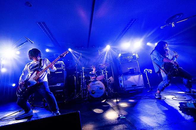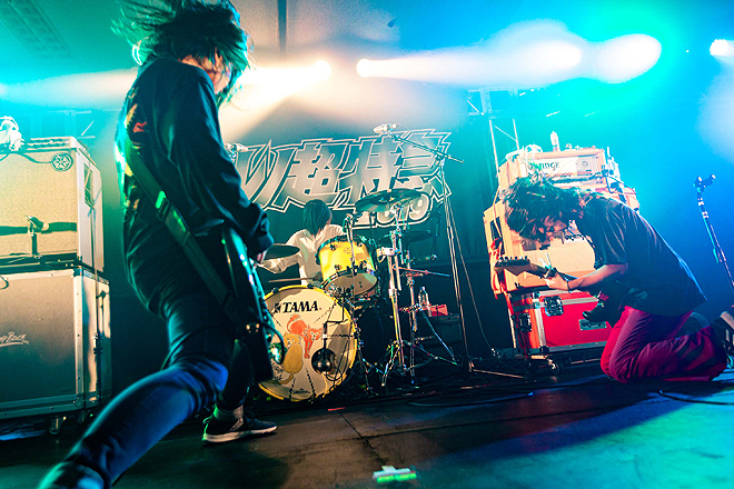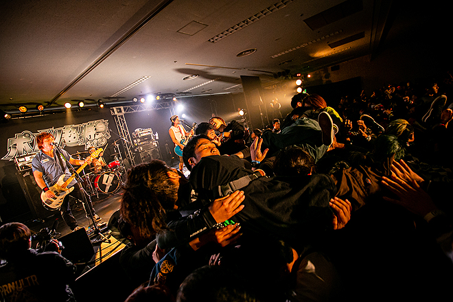 そして「ハローフィクサー」「1sec.」を経て鳴らされたのはROTTENGRAFFTYのトリビュート『ROTTENGRAFFTY Tribute Album ~MOUSE TRAP~』参加曲の「金色グラフティー」。TAKUMAが「どんな名曲か見せてやろうぜ!」と言った同曲、音源の再現率が高くて鳥肌が立ちまくり。大興奮したオーディエンスはステージの3人と一緒に歌い、叫び、跳び、暴れまくる。こんな愛が詰まったライブ、最高でしかない。
