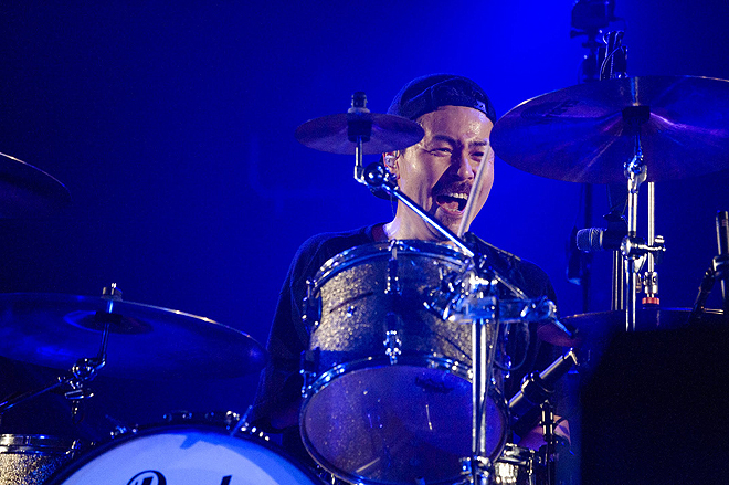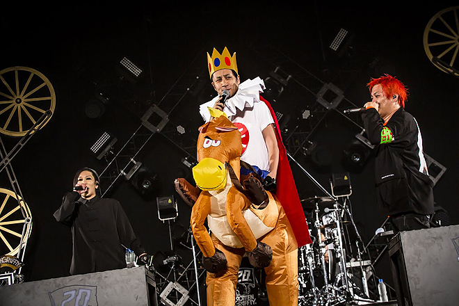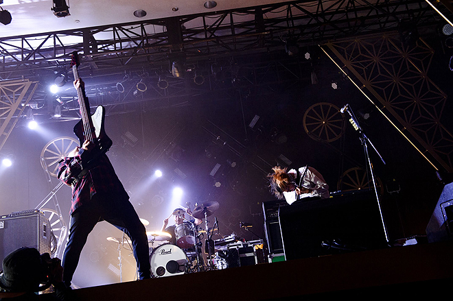 TAKUMA(Vo./Gt.)がロットン・KAZUOMIの衣装に身を包んで登場(髪の金色と黒色は左右逆)した10-FEET。ROTTENGRAFFTYの盟友である彼らのライブへの期待は凄まじく、金閣はパンパンに詰めかけた観客の熱気が充満している。