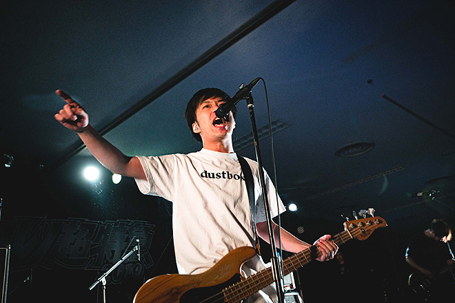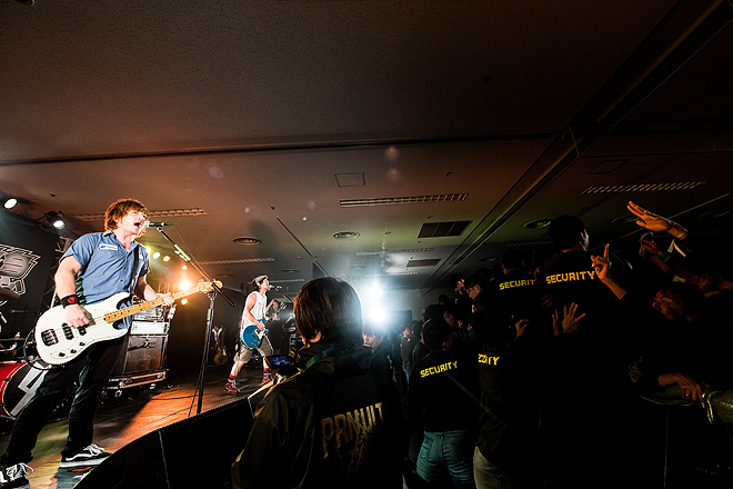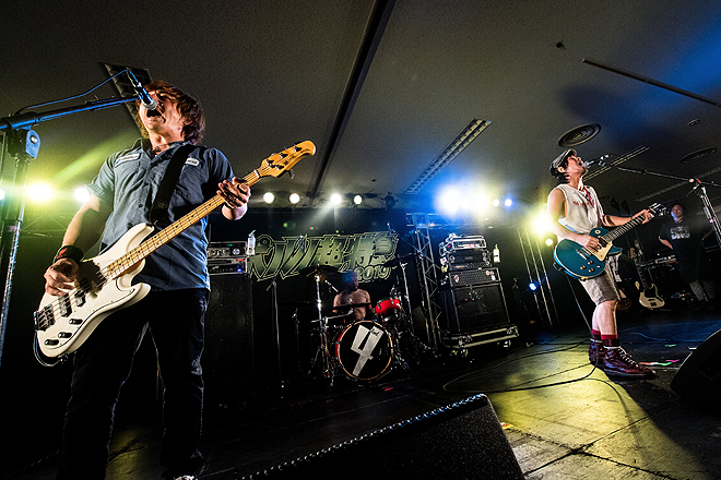 やべきょうすけ氏とROTTENGRAFFTYのメンバーによる挨拶の後、SE「河内のオッサンの唄」をMAKKIN(Ba./Vo.)とみんなで大合唱して幕を開けた銀閣トップバッター・GOOD4NOTHING。U-tan(Vo./Gt.)が「ロットンが作ってくれた最高のライブハウスへようこそ!」とライブスタート。