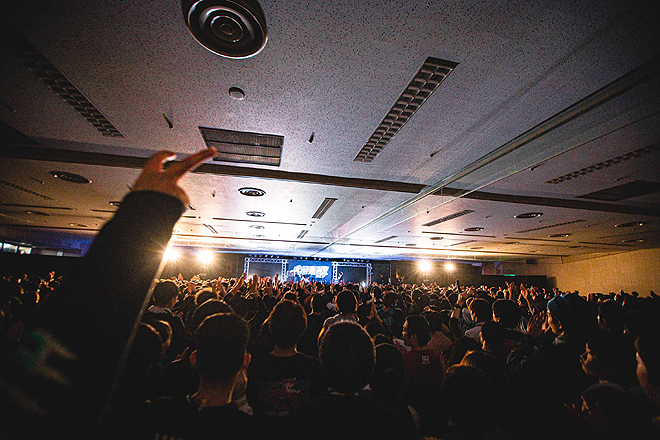 <ポルノ超特急2019>2日目。年の瀬の京都、寒風が吹きすさぶパルスプラザは朝早くからたくさんの観客で賑わっていた。昨日は出演者たちの気持ちが溢れ、来場者たちの想いが溢れ、熱くて濃い1日となったが、今日はいったいどのような1日になるのだろうか。2日目のタイムテーブルを見ながら談笑する人、物販ブースに並ぶ人、フードを楽しむ人、みんながみんな真冬のお祭りにワクワクと胸を踊らせている。