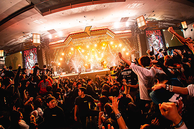 いきなり金閣をぐちゃぐちゃに盛り上げ、続けてMAHが「Next song is called……」という言葉の後に口にしたのは「……fuck’n“f.a.i.t.h”again!!」。まさかの「f.a.i.t.h」2連発に客席は歓喜の渦。更に「来いよ京都!」と挑発を一切緩めずに「KiLLiNG ME」「CROWS」とメガトン級のチューンを連射。彼らの度重なる挑発に沸騰状態となった金閣、その興奮は尋常ではない。