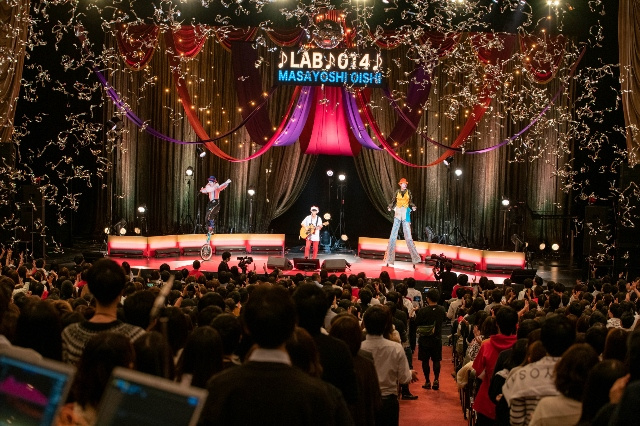 2人のピエロによる余興、そして当日研究所の助手として影ナレを担当した声優・鈴村健一によるアナウンスを経て、真紅のスーツを着た大石がステージへ。自己紹介ナンバーとしてお馴染みの「ピエロ」を歌い始めると、1曲目から集まった観客は手拍子で応える。トランペット、スキャット、ギターをいずれも「俺!」と紹介し、1人のステージを印象づけると、続いてはしっとりとした歌い出しから「幻想アンダーグラウンド」を披露。哀愁・物悲しさを漂わせたかと思えば、続く「ファイヤー!」では真っ赤にライトアップされたステージで、シャウトも交えながらハイテンションなパフォーマンスを見せた。