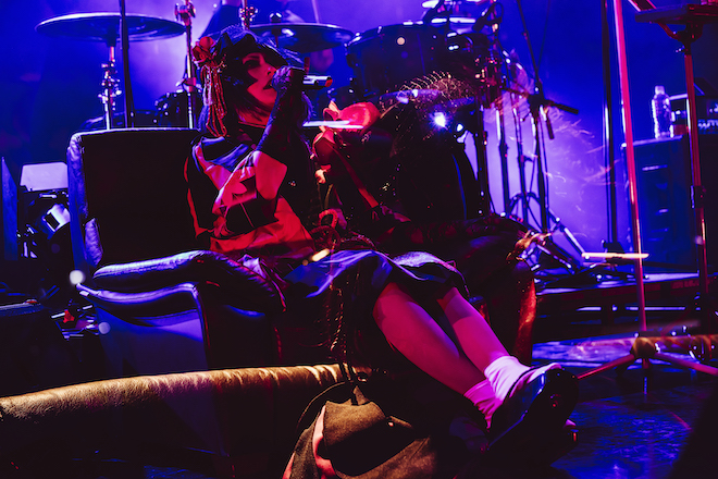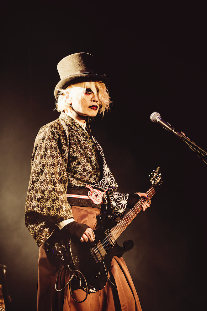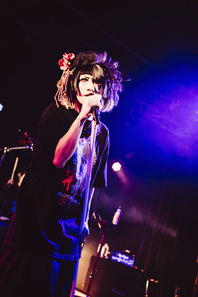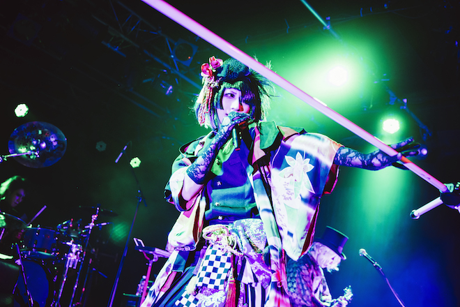 オープニングを彩ったのは、「色盲」。ステージ中央に設置されたソファにゆったりと腰かけ、歌い上げるマコト(Vo)。艶やかなヴィジュアルとも相まって、遠目にはいたいけな雰囲気さえ漂わせている。さらに「噫無情」と続くと、その歌声は切なさを帯びていった。力強いリズムを背景に、情感溢れる歌声が会場いっぱいに広がっていく。