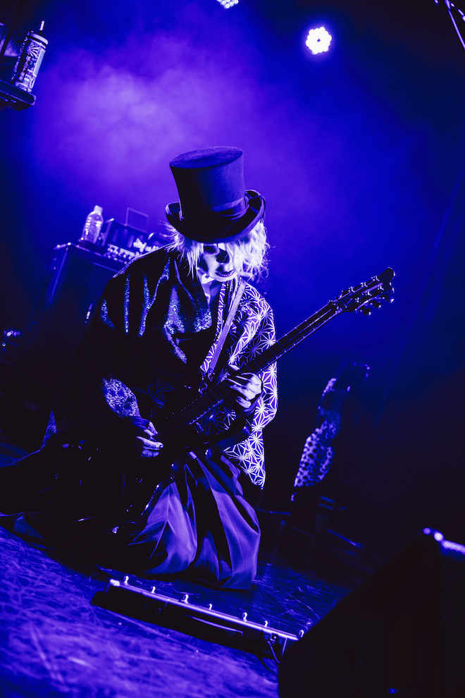 「BLAZE! 盛り上がっていきましょう。ようこそ!」と、オーディエンスに呼びかけ、マコトの動きとともに会場全体の空気が動き出す。続くのは「愛憎悪」だ。赤い包丁ライトがきらめくフロアを前に、KEN(G)も軽快なステップを踏む。勢いのあるサウンドとは裏腹に、歌を含め曲全体の雰囲気は情緒に満ちている。マコトの作り上げる色濃い世界とサウンドとの対比は、彼らの持つ大きな魅力だ。