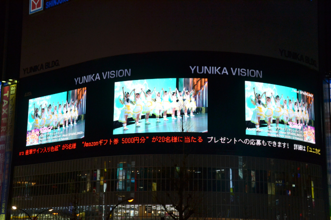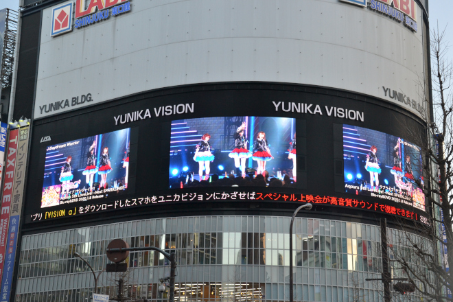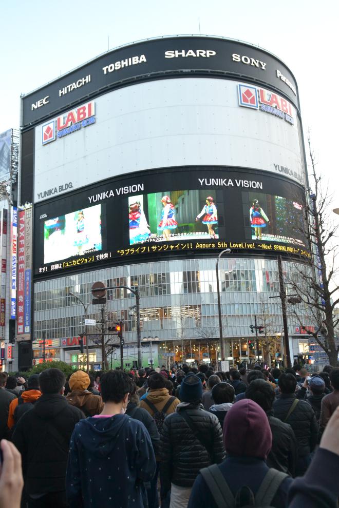 12月28日(土)、新宿のユニカビジョンで『ラブライブ!サンシャイン!!』のAqoursのライブ映像を初出しで上映するスペシャル上映会が開催された。寒空の下、会場には数多くのファンが集まってAqoursの映像と音に酔いしれ、リアルなライブ会場さながらの盛り上がりとなった。