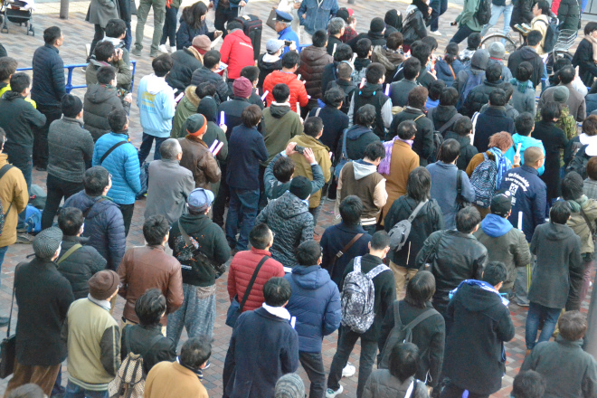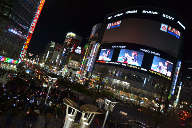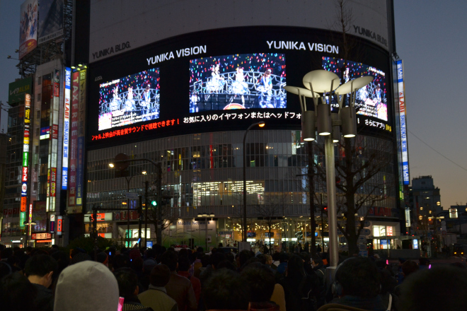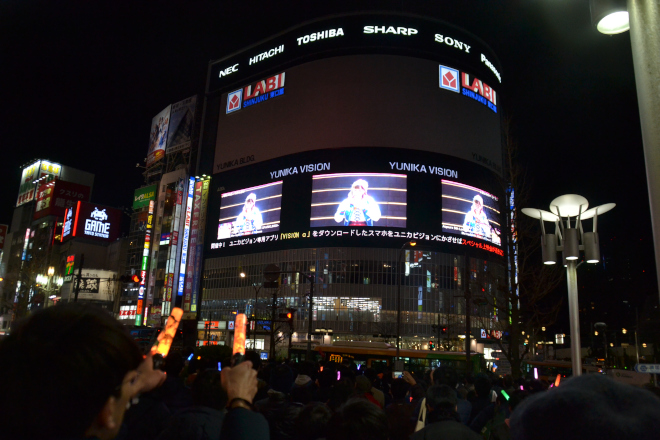 ユニカビジョンではこれまで様々なアーティストの上映会が開催されてきたが、その中でもとくに人気が高いのが「ラブライブ!」の上映会だ。今回も初出しのライブ映像が見られるとあって、会場となる西武新宿駅前ぺぺ広場には多くの人が集まった。ちょうどこの日はコミケの開催日だったこともあって、いつものように早くから超満員、というわけではなかったものの、直前になってコミケからの帰りに来た人たちも多数合流し、上映開始時刻には、広場内に設定された視聴エリアはほぼ満員の状態になった。