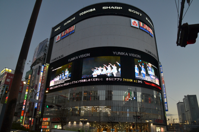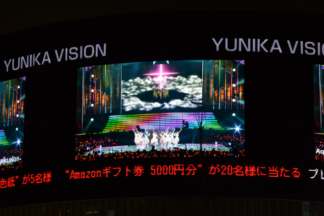 ユニカビジョンの公式Twitterでは、この上映会の生配信も行われていた。ビジョンに映し出されるライブ映像を中心に、視聴エリアなど周囲の映像も見ることができたので、この日この会場に来れなかった人でも、会場の雰囲気を味わうことができただろう。