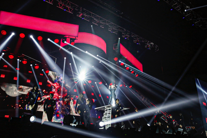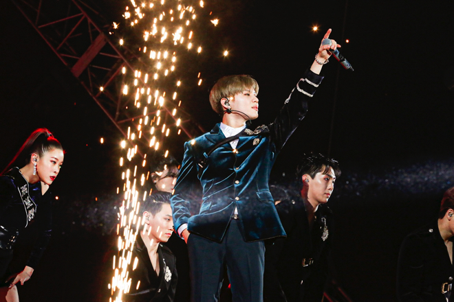 後半戦は、こちらもテミンのツアーの中でも人気の楽曲「Into The Rhythm」でスタート。ホワイトとグリーンのジャケットを羽織り、楽しそうにパフォーマンスするテミンが印象的。曲の後半でボルテージがあがったところで、銀テープが飛び出すなど、ファンともども楽しめるステージとなっていた。盛り上がる会場の中、SuperMとして一緒に活動しているEXOのカイをフィーチャリングに迎えた楽曲「Pretty Boy」を披露。炎の演出などもあり会場をさらに盛り上げた。そのままの勢いで、「Press Your Number」「Goodbye」「MOVE」などを披露し会場の心を魅了し、本編が終了した。