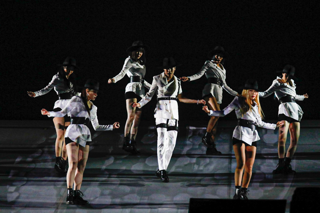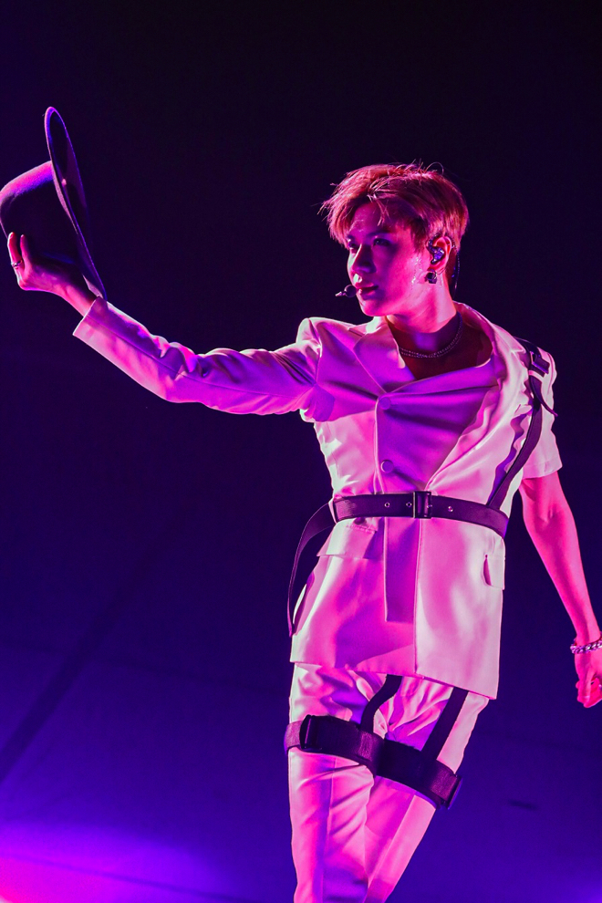 最初のMCでは、久々の日本での公演ということで、「お久しぶりですよね? みなさん、お元気でしたか?」とパフォーマンスとは違った優しい表情でファンに問いかけた。さらに、今回のステージへの意気込みを語った。MC後に、披露したのは「Play Me」。ステージ上の傾斜のついた、スロープステージ上でテミンならではの妖艶なダンスを披露する。続いて、今年開催された<TAEMIN ARENA TOUR 2019~X™️~>のオープニングで披露され、記憶に新しい「Ace」をパフォーマンス。センターステージへ移動してのパフォーマンスは、その立ち振る舞い含め、“ACE”たる風格すら感じるものであった。さらに、「One By One」では、スロープステージの角度が、さらに急になったシチュエーションでロープをつけて宙を舞うかのようなテミンならではのダンスを披露。ダンサーを含めて、新たな挑戦で魅せるテミンのステージはエンターテイメントを凌駕する芸術作品にすら感じるものがあった。
