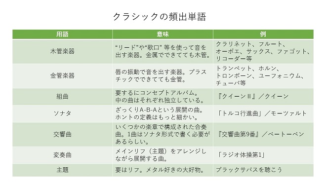 ただ聴くだけならば、楽器構成や形式なんて大して気にしなくて良い。しかし、「ふうん、この曲は協奏曲なんだね」「吹奏楽の響きは管弦楽と違うね」「おっ、ソナタ形式なんだ」「この曲、第2楽章は舞曲なんだね」とか言えたらカッコいいので、覚えておいて損はない。