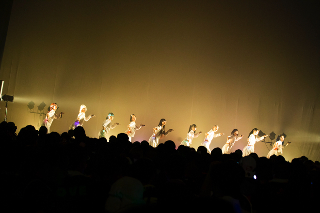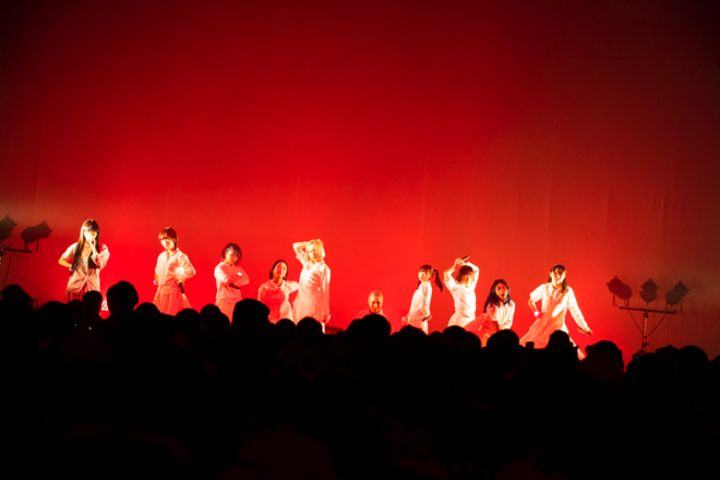 声色を可愛らしく変えたココ扮するハロパテが登場すると、「ここにいるみんなの未来が輝くと信じて歌います」と「FOUL」へ。「前から後ろまで最後まで楽しんでいきましょう!」と叫び、「QUEEN OF POP」を披露。イントロが流れた瞬間、悲鳴にも似た歓声が起こったギャンパレ冬の代表曲「WINTER SONG」、所属事務所WACKの物語を感じさせる「LAST」、現10人体制の代表曲「らびゅ」をハートが溢れるステージ映像の前で披露すると、「みんな違ってみんないい」と歌う「CAN’T STOP」で手を繋ぎあって歌い、本編は終了した。