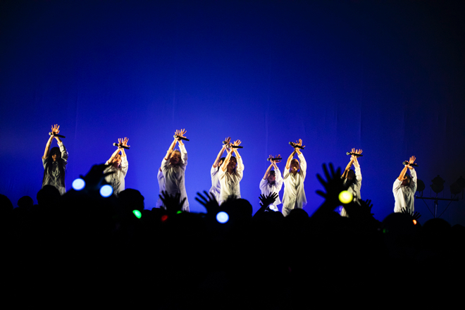 サンリオのキャラ帽子を被った遊び人や子供連れが数多く集まった会場に、お馴染みのSEが流れ切ると、10人のメンバーたちがステージに登場。意表をついたセクシーで大人っぽい「FAKE and FANTASY」でライブがスタートし、サンリオ仕様の映像が流れるステージで「sugar」を披露すると、「今年最後のライブ、楽しんでいきましょう!」とナルハワールドが叫び、アッパーなメロコアチューン「BREAKING THE ROAD」へ。「一緒に踊って熱くなろうね!」とキャン・GP・マイカが遊び人に投げかけると「Wake up Beat!」で遊び人たちとともに飛び跳ね、のっけから会場の温度を上げていった。
