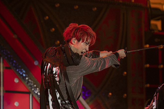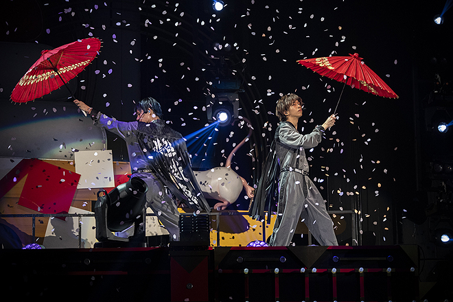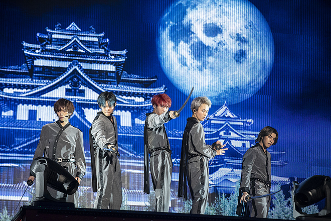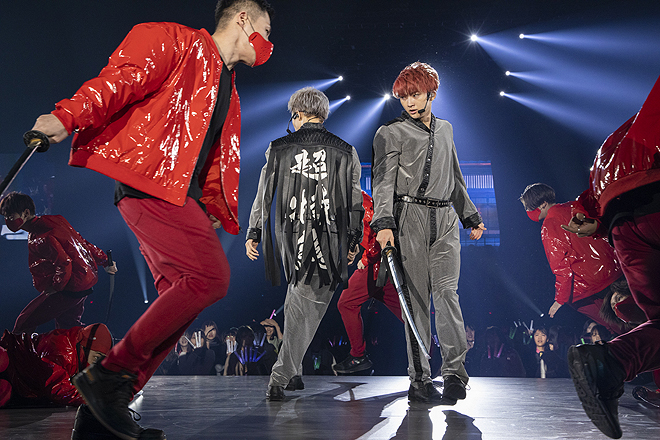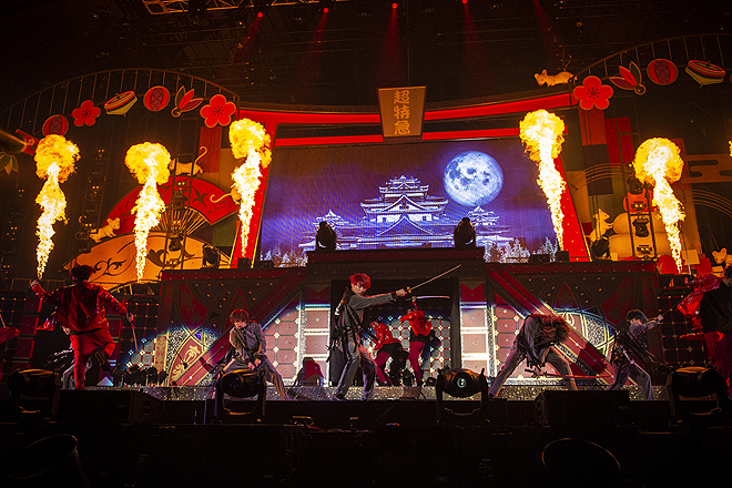 レーザー光線が飛び交うなか、表情豊かに飛び跳ねるソウルな最新シングル「Revival Love」までノンストップで駆け抜けて、MCでは結成初期から目標にしていた会場に戻ってこれた喜びを吐露。続いて懐かしのイントロに歓声が湧いた1stシングル「TRAIN」へと時間を巻き戻しつつ、リリース当時の比ではない格段の余裕で8年の成長を示したところで、さらに時代は逆行する。琴や笛の音と共にステージのモニター上に城砦がそびえ、そのお庭番集といった様相でスモークの中にメンバーが登場すると、背中に“超特急”の文字を背負いながら、攻め入ってきた敵軍を見事な刀さばきで華麗に撃退。血沸き肉躍るサイケな和風トランスBGMに、ここから7分超にわたりバトルアクトが続いたが、特筆すべきは殺陣のダイナミズムのみならず、“ショー”としての艶やかさだ。カイとリョウガが赤い和傘をたおやかに翻せば桜吹雪が舞い、妖美に扇子を操って敵をなぎ倒すリョウガの姿は、もはや現実には存在しない二次元キャラの趣。雅やかな二人に対し、センターステージではタクヤとユーキが背中合わせで武闘派な戦いを繰り広げ、二人が「エイヤッ!」と刀を振り下ろせば、バッと血飛沫の赤い紙吹雪が噴き上がる。タカシも敵とのシンクロダンスで舞い、ユーキは敵陣の真っただ中、連続アクロバット技で鮮やかな宙返りまで。花道や客席通路を走り抜けて縦横無尽に展開される躍動感満点のフォーメーションや、刀を受けてのうめき声までリアルな迫真の演技、そしてクライマックスで噴き上がる炎に8号車からは悲鳴が鳴りやまない。一転、和楽器の音色で彩ったスペシャルアレンジの「Kura☆Kura」では、さっきまでの敵をバックダンサーに従えて客席を挑発。ステージの上段からは日本古来の伝統奇術・和妻の金ピラマジックで金色の巻紙を階下にヒラヒラとはためかせ、お正月ならではの“和”を前面に押し出したメニューで沸かせてくれた。