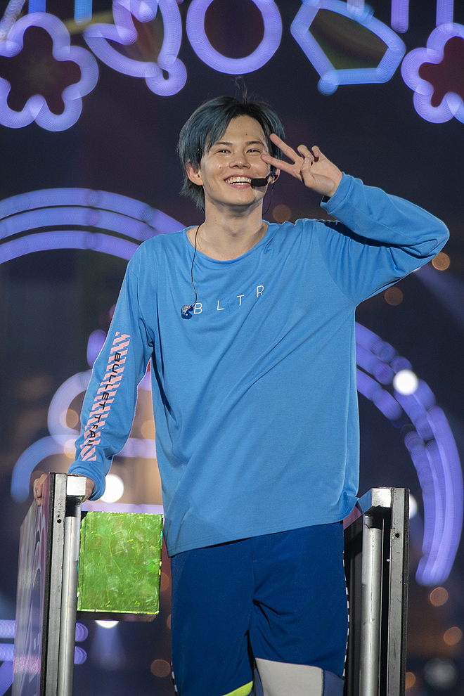 3曲目の「Burn!」からは早くもサプライズが飛び出し、なんとクリア素材のステージが持ち上がって前方にせり出すと、アリーナ席の頭上を後方に向かって大移動!高々と上昇したステージの上からバッテンダンスを繰り出すメンバーに向かい、「腹から声出せ!」と煽るカイに応えて8号車がペンライトを振り上げる景色も実に壮観で、カラフルな光の海を渡ってゆくメンバーと共に大合唱する客席からは「超特急を真下から眺められるなんて!」という驚きの声が漏れる。そのままアリーナ席のど真ん中に設置されたセンターステージに着地して、「PUMP ME UP」のシュールなパラパラダンスを360度の8号車に向かって放てば、さらにステージはアリーナ最後方へと移動して、「Secret Express」の曲中タクヤは余裕たっぷりの投げキスで8号車を悩殺。トドメとばかり「お前ら楽しむ準備できてるのか!?」とリーダー・リョウガが叫んでの「PAPAPAPA JUMPERS」ではジャケットを脱ぎ捨て、トロッコでアリーナを縦断しながら客席に手を振り、スタンド席正面の花道を疾走してメインステージへと帰還するスペクタクルな展開に8号車も狂喜乱舞だ。