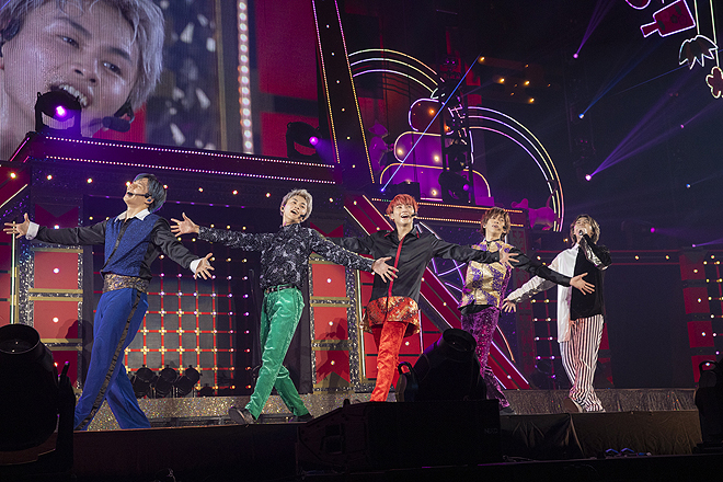 今回のアリーナツアーも全5公演すべてのチケットが即日完売。耐震改修工事を終えて営業再開したばかりの本会場で超特急がライブをするのは3年ぶり3回目だが、3デイズは初めてにもかかわらず、スタンド席の端の端まで各日8号車に埋め尽くされた。高まる熱気のなか、書き初めされた“超特急”の文字が躍り、袴姿のメンバーが舞うオープニング映像を映した紗幕が落ちると、ステージ上にはそれぞれイメージカラーに和柄の入った煌びやかなセットアップ姿のメンバーが。そして“超特急”と記された扁額を掲げた鳥居の中央に立ち、ユーキが「新年あけましておめでとうございます。みんな、今日は最高の1日にしようぜ!」と宣言するや、鼓や尺八の音で和風アレンジされた「SAY NO」でライブを幕開ける。鏡餅や扇、独楽や羽根つきといったお正月アイテムがネオンに輝き、今年の干支にちなんで6匹のねずみが鎮座するステージで、ド頭から火花がスパークする華々しいオープニングに8号車は熱狂。メンバーもタフなアッパーチューンで息の合ったダンスを見せながら、「あけおめ!」と飛び跳ねたり、「ねずみ年!ちゅっちゅちゅ~」とコールを変えたりと、全身でお正月感を醸し出してゆく。続いてドロップされた「Don’t Stop 恋」のハチャメチャ&ナンセンスなダンスも、次々にネオンの色を変えるド派手なステージと相性ピッタリ。喜怒哀楽の感情を目まぐるしく変化させながら、遊びの利いたタカシのボーカルと共に新年の喜びを伝えてくれる。