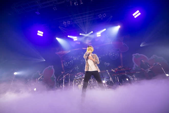 ステージ両脇に置かれているのは、いちごが乗った可愛らしいピンクの鏡餅オブジェ。SEが流れ始めると、るぅとのイメージカラーである黄色一色へフロアが煌めき始める。そんななか、手を振りながら元気よく登場したるぅと。オープニングを飾ったのは、頑張る自分に花丸を付ける「君はいつも100点満点!」だ。ポジディヴオーラ全開のまま、両脇のお立ち台にジャンプするなど、心のアクセルを踏み込んだるぅとの足は止まらない。まるで、ジェットコースターに乗っているかのようにくるくると走る先に繋いだのは、叶わない恋に一筋の希望を持つ「ヒロインと生徒B」だった。フロアにマイクを向けては笑顔を振りまくるぅとは、同空間だからこその気持ちの共有を忘れない。