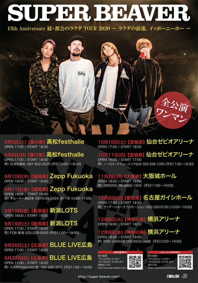 2020年4月に結成15周年を迎えるSUPER BEAVERが、9月から12月にかけてアニバーサリーツアー第2弾<SUPER BEAVER 15th Anniversary 続・都会のラクダ TOUR 2020 ~ ラクダの前進、イッポーニーホー ~>を開催する。