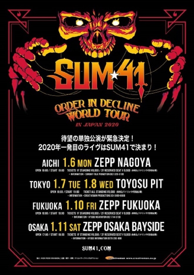 2019年3月、日本初開催となった<Download Japan 2019>に出演したSUM41。JUDAS PRIEST、SLAYER、ANTHRAX、GHOSTなどメタル猛者がずらりと並ぶラインナップにおいて、一歩も引かない剛腕パフォーマンスで観客を焚き付けた彼らが今回、2019年7月リリースの7thアルバム『ORDER IN DECLINE』に伴う単独公演として、名古屋、東京、福岡、大阪の4都市5公演を敢行中だ。ここでは<ORDER IN DECLINE WORLD TOUR IN JAPAN 2020>東京2DAYSの最終日にあたる1月8日の豊洲PIT公演の模様をお伝えしたい (※福岡、大阪公演をまだ控えているため、ネタバレが嫌な方はご注意を)。
