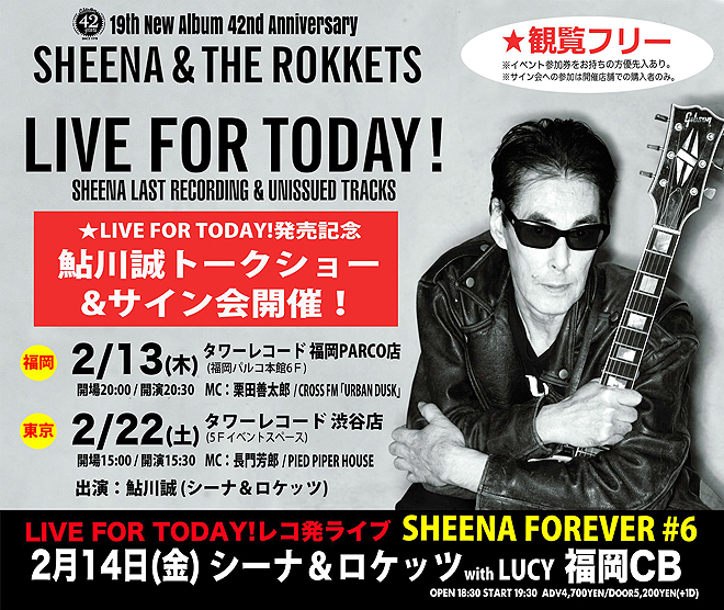 また翌日のシーナの命日である2月14日(金)には、今年で6回目を迎えるシーナの命日追悼ライブ<SHEENA FOREVER #6>が福岡LivehouseCBにて開催される。ゲストボーカルには末娘のLUCYの参加も予定。なお前売りチケットは、1月16日(木)から一般発売される。