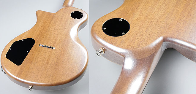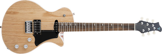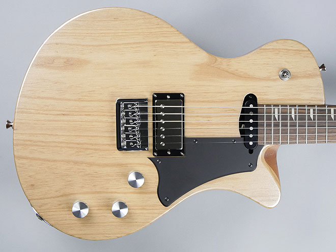▲マホガニーのボディ&ネックに、ボディトップは4mmのライトアッシュをあしらい天然の杢目が美しいギターに仕上げた。