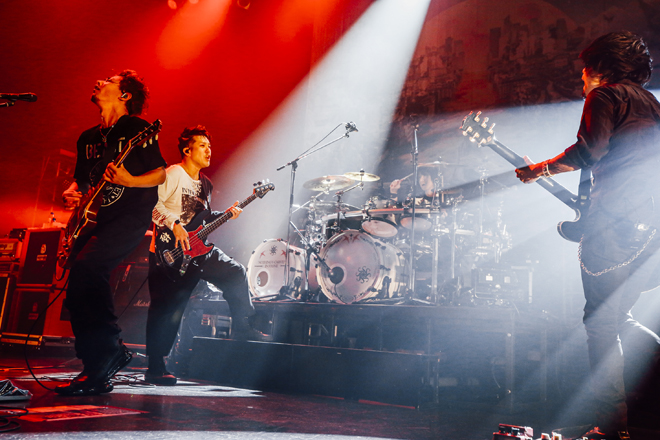 19時6分、SEが流れると、村松拓(Vo/Gt)、生形真一(Gt)、日向秀和(Ba)、大喜多崇規(Dr)のメンバー4人が紗幕ごしに姿を現し、「Who Is」が始まるやカーテンが落ちると、会場は興奮状態に包まれていく。威風堂々たるバンド・サウンドを鳴らした後、「行こうぜ!」と村松は声をかけ、次は「In Future」へ。爽快なメロディと骨太のグルーヴで一気に攻め立てると、大勢の観客が拳を突き上げてノッていた。その右肩上がりの高揚感に「Blow It Up」を見舞うと、ウォーウォー!の大合唱で早くも会場を一つに束ねていた。