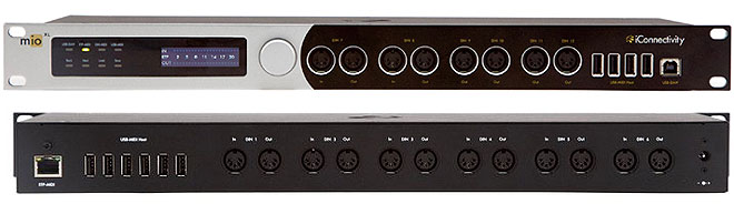 ▲ラックマウント対応のmioXLは8IN/12OUTのMIDI(前面の右4つはOUT)、10ポートのUSB-MIDIを搭載。パネルにディスプレイ、ロータリーエンコーダーも備える。