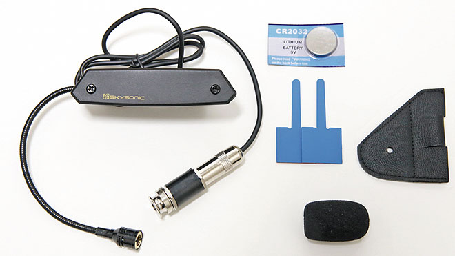 パッケージには、ピックアップ本体(エンドピン・ジャック付き)、エンドピン・ジャック吊り下げ用ストラップ、コンデンサー・マイク用ウィンド・スクリーン(スポンジ・カバー)、3Vボタン電池(CR2032)、ピックアップ・ケーブル用リテイナー・クリップ、マニュアルが付属する。推奨取り付けサウンドホール・サイズは90~105mm。