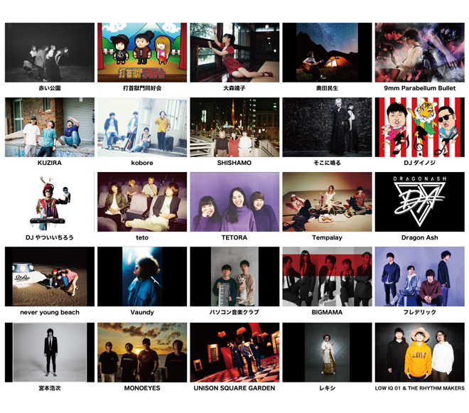 今回出演が明らかになったのは、赤い公園、打首獄門同好会、大森靖子、奥田民生、9mm Parabellum Bullet、KUZIRA、kobore、SHISHAMO、そこに鳴る、DJダイノジ、DJやついいちろう、teto、TETORA、Tempalay、Dragon Ash、never young beach、Vaundy、パソコン音楽クラブ、BIGMAMA、フレデリック、宮本浩次、MONOEYES、UNISON SQUARE GARDEN、レキシ、LOW IQ 01 & THE RHYTHM MAKERSの25組を発表した。これで現在、全63組の出演アーティストが発表されている。