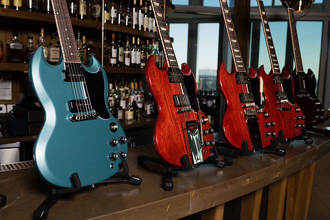 そして、カスタム・ショップは最新のヒストリック・リイシューの中から、カスタム・カラーを採用したモデルも披露。それらには、1963 & 1964 Firebird V、1964 SG Standard、 1965 Non-Reverse Firebird V、 1967 Mahogany Flying V(以上全てMaestro Vibrola付き)、1963 SG Special with Lightning Bar、Modern Les Paul Special Double Cutが含まれる。