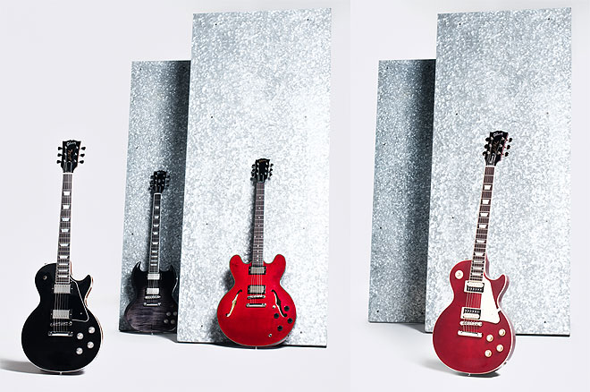 ▲Modern CollectionのLes Paul Classic Translucent Cherry(左)、Les Paul Modern、SG Modern、ES-335(右)。