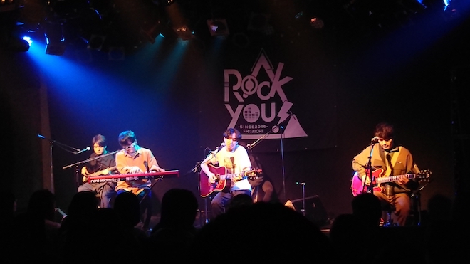 ハートアップの学割キャンペーンの一環として 計60組120名を招待して行われた今回のライブでは、FM AICHIのパワープレイ曲にもなっていた「ヤングアダルト」やメンバーが学生の頃を思い出しながら作られたという「青春と一瞬」などが、はっとり(Vo)の弾き語りで3曲、フルメンバー登場によるアコースティック編成で4曲披露された。